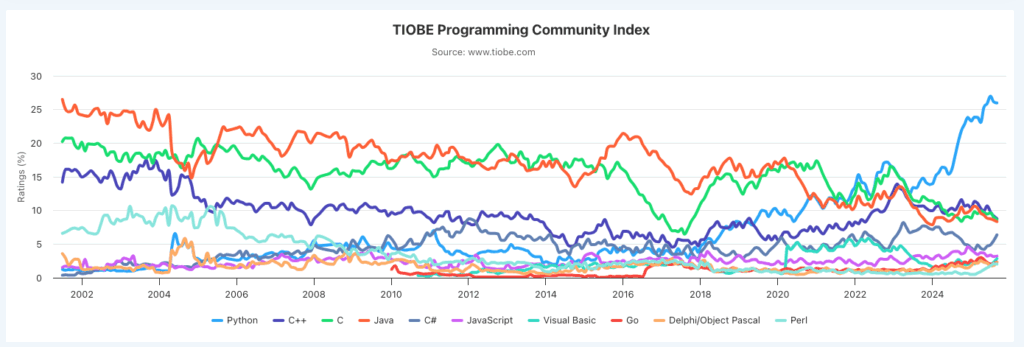 Pythonは、世界的なプログラミング言語の人気ランキング(TIOBE Index や PYPL)で常に上位にランクインしています。特に近年は、JavaやC言語を抜いて1位や2位を争うことも多く、利用者数は年々増加しています。