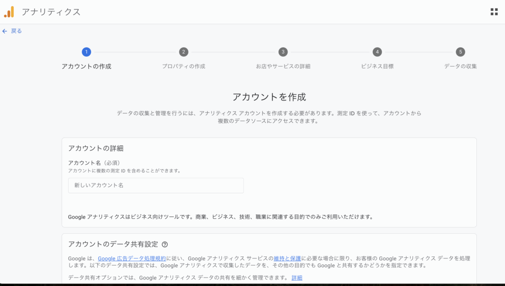 Googleアナリティクス公式サイトにアクセスし、Googleアカウントでログインします。その後、ブログ用の新しいプロパティを作成し、トラッキング用の情報を設定します。